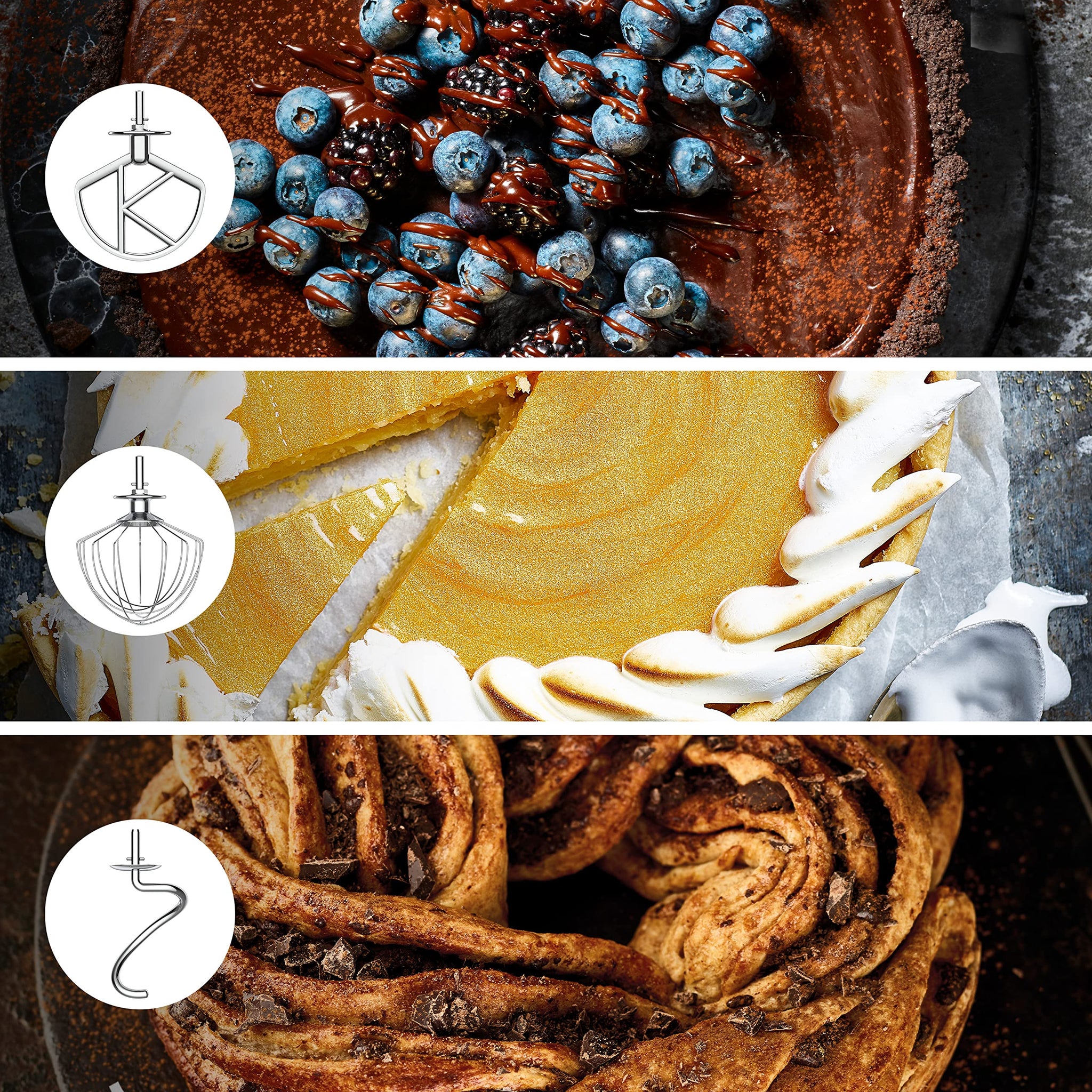 - VIELFÄLTIGES ZUBEHÖR INKLUSIVE: Das 3-teilige Backset enthält einen K-Haken, einen Schneebesen und einen Knethaken, sowie einen Spritzschutzdeckel mit praktischer Nachfüllöffnung für maximalen Komfort beim Zubereiten