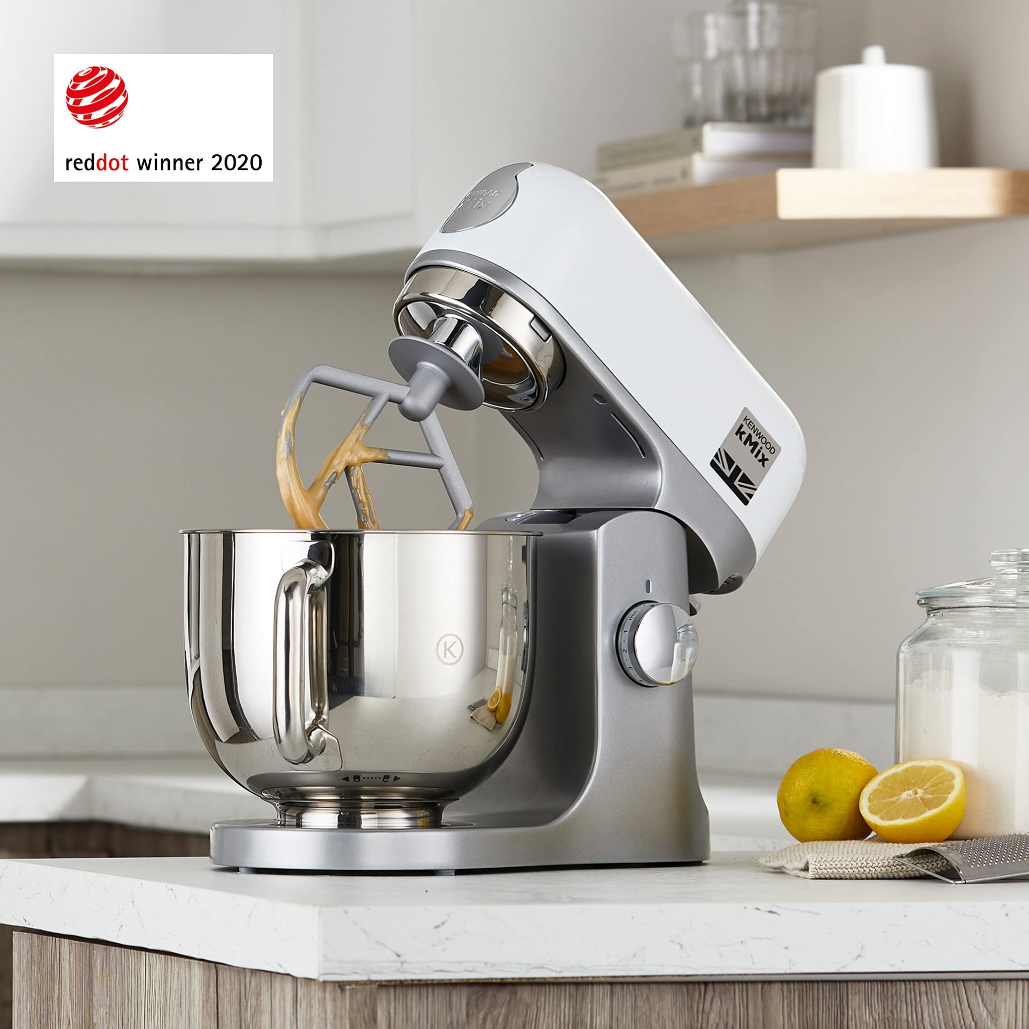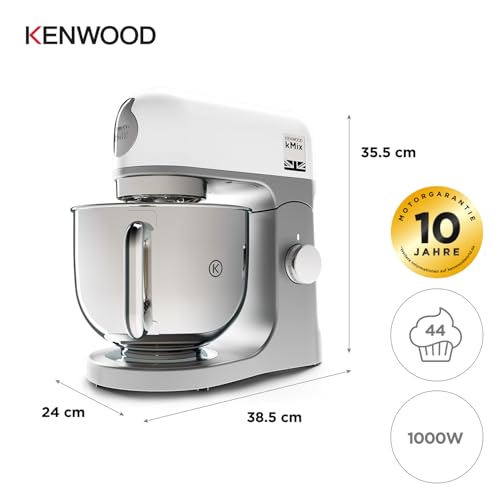 Kenwood kMix KMX750WH Küchenmaschine, 5 l Edelstahl Schüssel, Safe-Use-Sicherheitssystem, Metallgehäuse, 1000 Watt, inkl. 3-Teiligem Patisserie-Set und Spritzschutz, Weiß