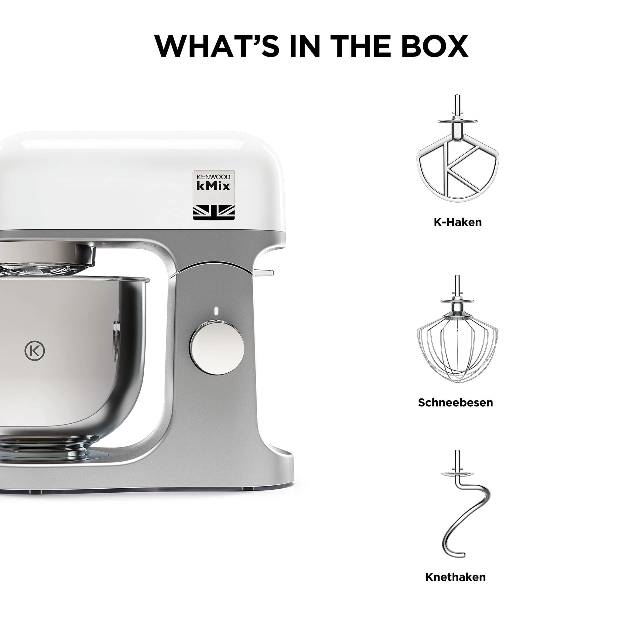 - ENTHALTENES ZUBEHÖR: 3-teiliges Patisserie-Set, bestehend aus K-Haken, Rührbesen und Knethaken sowie einem Spritzschutz mit separater Einfüllklappe
