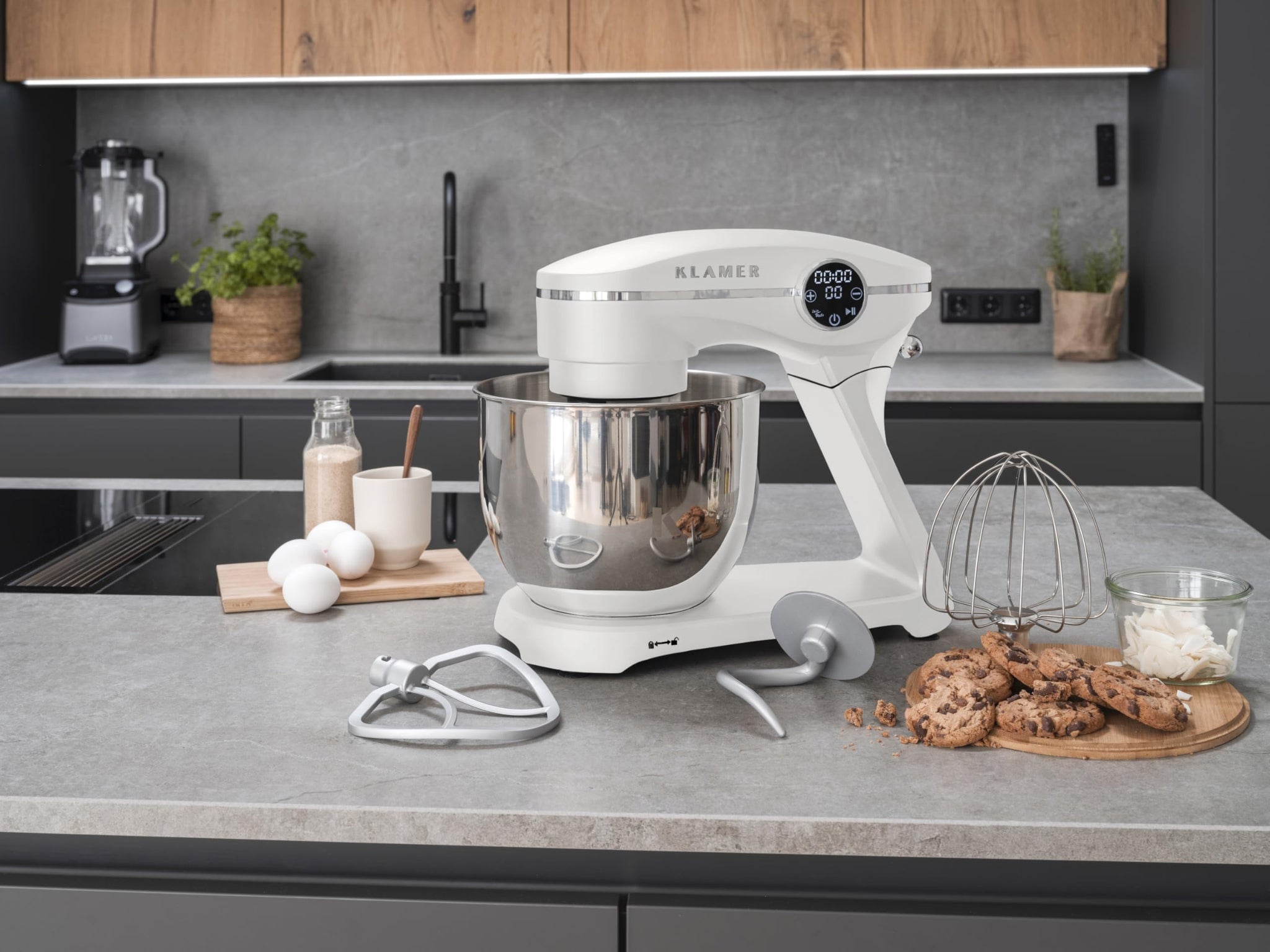 KLAMER Küchenmaschine 1800W, Knetmaschine Brotteig mit Edelstahl-Rührschüssel 6 L, 10 Stufen mit Timer, Planetenrührwerk, Rührbesen, Knethaken, Schneebesen & Sichtdeckel (weiß)